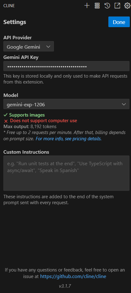 API Provider → Google Gemini → API Key를 Gemini API Key에 입력 → Model : gemini-exp-1206 선택
